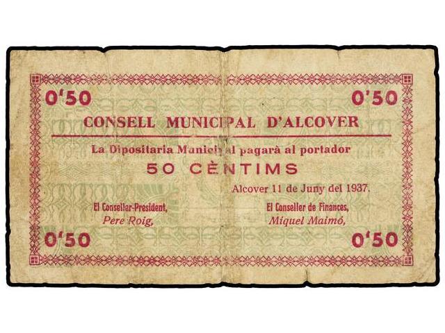 50 Cèntims. 11 Juny 1937. C.M. d´ALCOVER. (Sucio). ESCASO. AT-86; T-109. MBC-.
