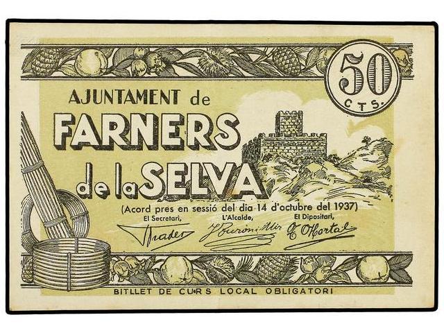 50 Cèntims. 14 Octubre 1937. Aj. de FARNERS DE LA SELVA. (Restos de adhesivo en reverso). AT-994 ; T-1148. EBC-.