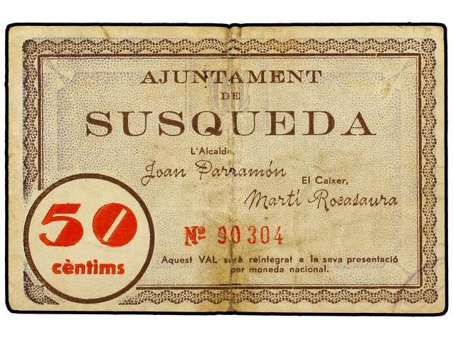 50 Cèntims. 15 Agost 1937. Aj. de SUSQUEDA. (Reparaciones). MUY ESCASO. AT-2424; T-2814. MBC-.