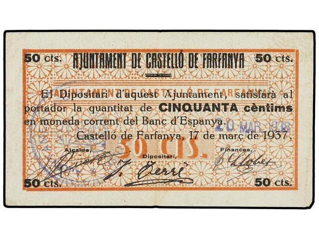 50 Cèntims. 17 Març 1937. Aj. de CASTELLÓ DE FARFANYA. Sello tampón azul redondo. Firmas con nombres diferentes. Además de una segunda fecha del 20 Març 1938, día de la retirada del billete. AT-749g; T-873g. MBC+.