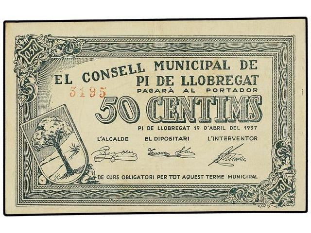 50 Cèntims. - 19 Abril 1937. - C.M. de PI DE LLOBREGAT. - (Leves manchitas). AT-1818; T-2102. EBC. - -