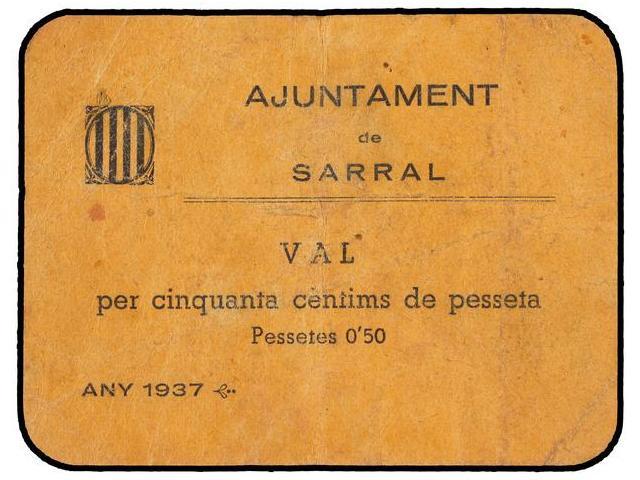 50 Cèntims. 1937. Aj. de SARRAL. Cartón. Tirada: 1.000 billetes. RARO. AT-2286; T-2637. MBC.