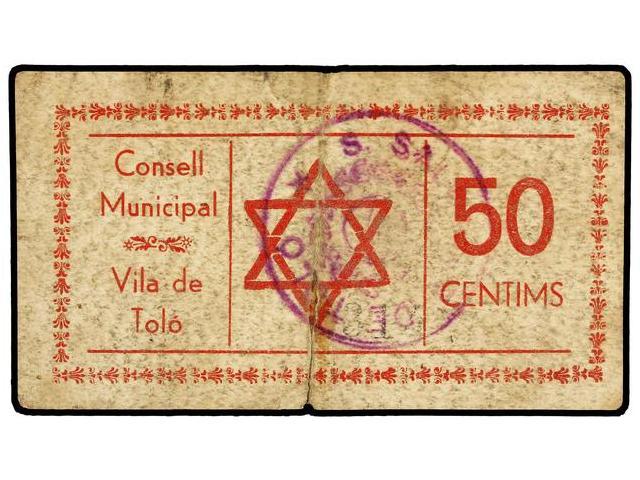 50 Céntims. 1937. C.M. VILA DE TOLÓ. Cartón. (Sucio, roturas reparadas con adhesivo). MUY RARO. AT-2498 ; T-2893. (MBC-).
