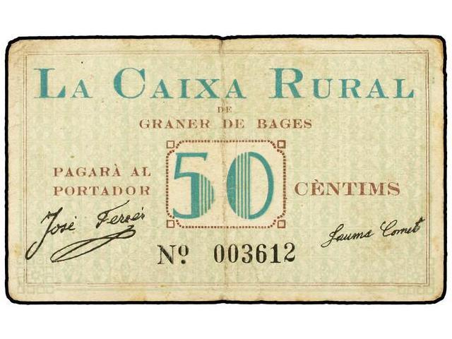 50 Cèntims. 1937. LA CAIXA RURAL DE GRANER DE BAGES. (Leves roturas). T-1347. MBC-.