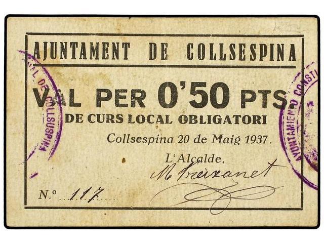 50 Cèntims. 20 Maig 1937. Aj. de COLLSESPINA. Cartón. MUY ESCASO. AT-861; T-999. MBC+.
