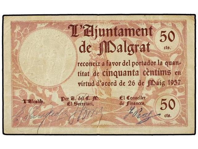 50 Cèntims. 26 Maig 1937. Aj. de MALGRAT. ESCASO. AT-1407; T-1607. MBC.