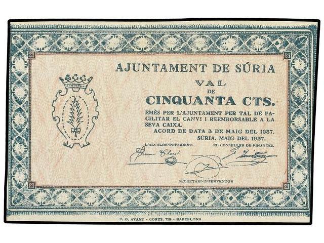 50 Cèntims. 3 Maig 1937. Aj. de SURIA. (Mal cortado margenes laterales). AT-2417 c;T-2807 c. S.C.