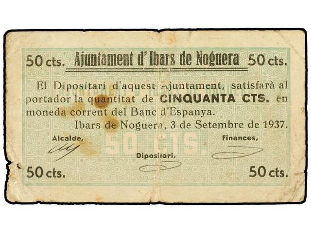 50 Cèntims. 3 Setembre 1937. Aj. d´IBARS DE NOGUERA. (Pequeñas roturas y manchitas). MUY RARO. AT-1265; T-1441. MBC-.