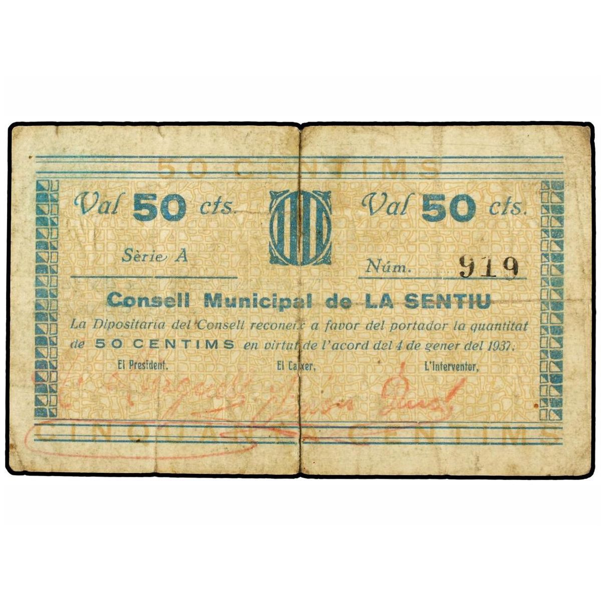 50 Cèntims. - 4 Gener 1937. - C.M. de LA SENTIU. - (Roturas). MUY RARO. AT-2336; T-2704. MBC-. - -