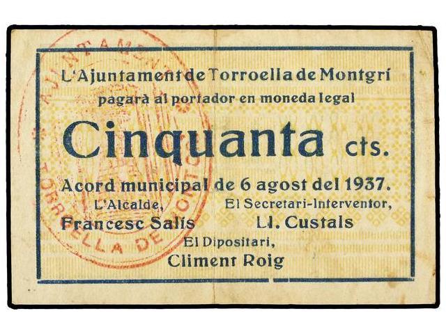 50 Cèntims. 6 Agost 1937. Aj. de TORROELLA DE MONTGRÍ. ESCASO. AT-2564; T-2989. MBC+.