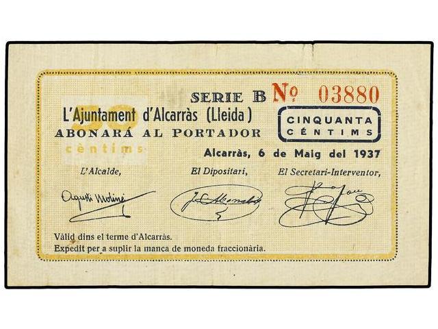 50 Cèntims. 6 Maig 1937. Aj. d´ALCARRÀS. ESCASO. AT-79; T-102. MBC+.
