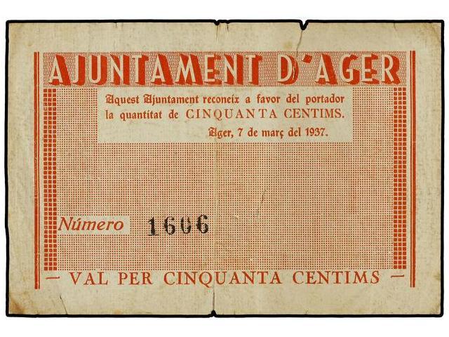 50 Cèntims. 7 Març 1937. Aj. d´ARGER. Sin sello-tampón. (Roturas). AT-4b; T-7b. MBC-.