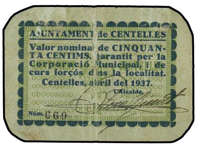 50 Cèntims. Abril 1937. Aj. de CENTELLES. Cartón. RARO. AT-803; T-930. MBC.