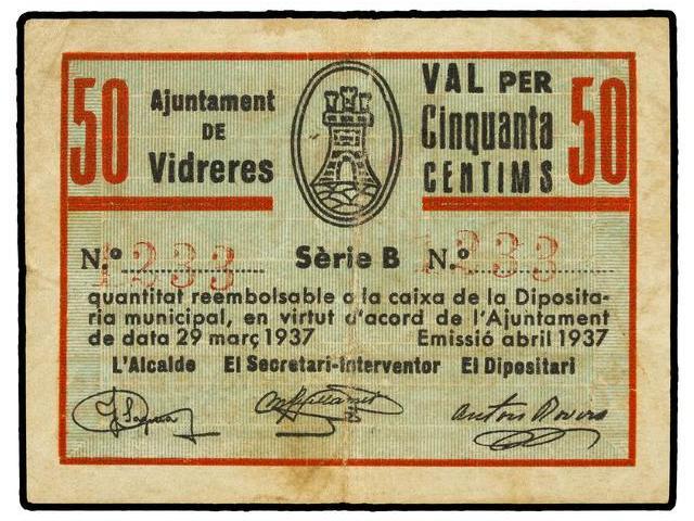 50 Cèntims. Abril 1937. Aj. de VIDRERES. (Algo sucio). ESCASO. AT-2739; T-3162. MBC.