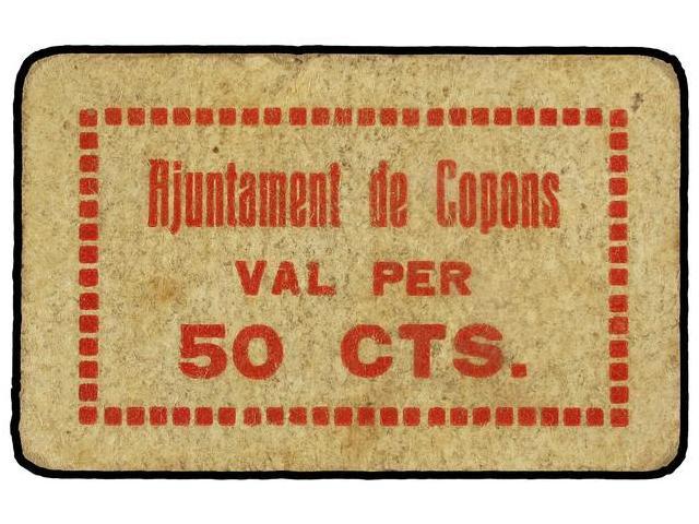 50 Cèntims. Aj. de COPONS. Cartón. RARO. AT-870; T-1010. MBC+.