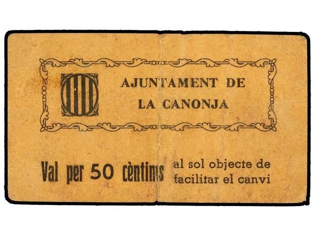50 Cèntims. Aj. de LA CANONJA. Cartulina. Nº3. MUY ESCASO. AT-641. MBC.