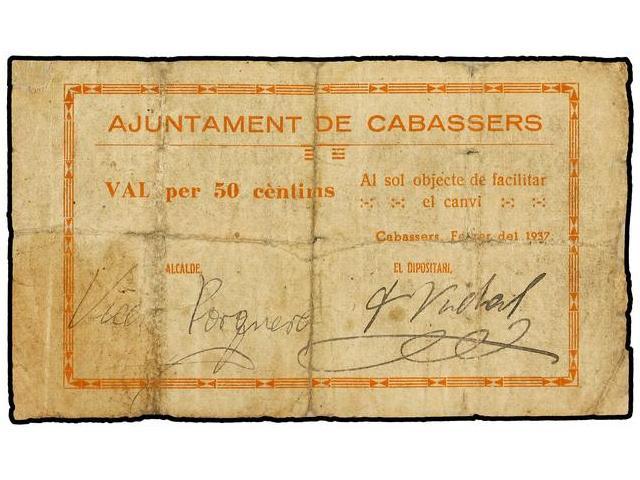 50 Cèntims. Febrer 1937. Aj. de CABASSERS. (Roturas y manchas) (Reparado). MUY RARO. AT-546 ; T-643. BC-.