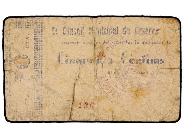 50 Cèntims. Juliol 1937. C.M. de CASERES. (Roturas reparadas con cinta adhesiva). MUY RARO. AT-683; T-802. BC+.