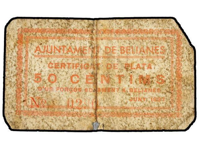 50 Cèntims. Juny 1937. Aj. de BELIANES. (Roturas. Esquinas rotas). RARO. AT-350. BC.