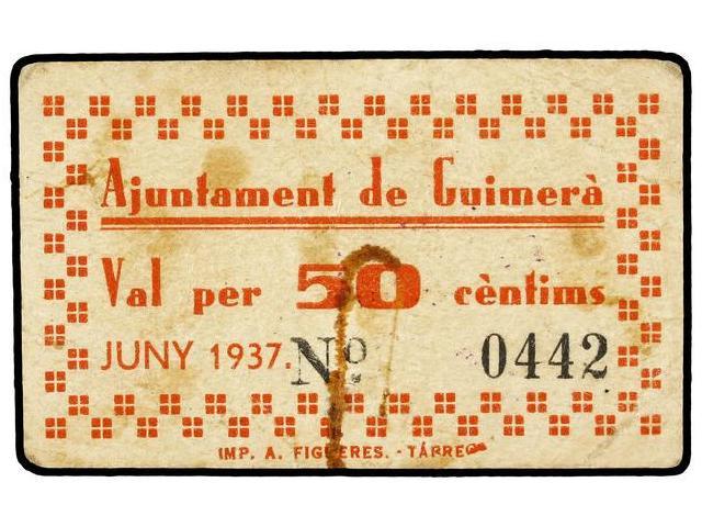 50 Cèntims. Juny 1937. Aj. de GUIMERÀ. Cartón. (Manchas). RARO. AT-1218; T-1395. MBC.