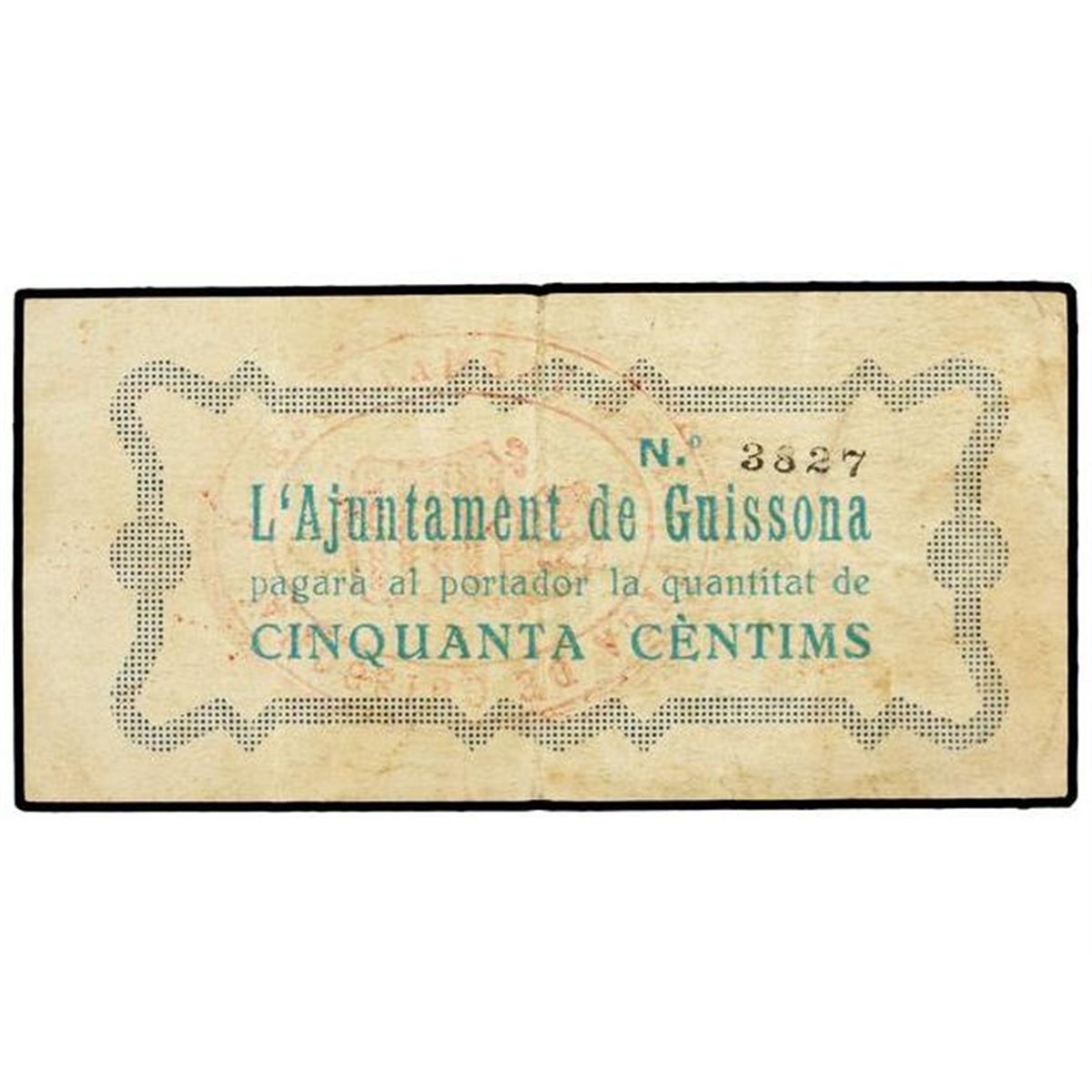 50 Cèntims. - Juny 1937. - Aj. de GUISSONA. - Signatura estampillada en rojo, sello tampón rojo (Algo sucio). ESCASO. AT-1226a; T-1403a. MBC+. - -