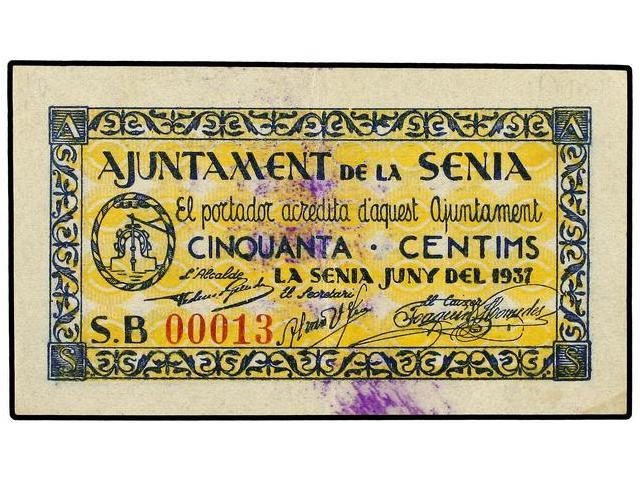 50 Cèntims. Juny 1937. Aj. de LA SENIA. (Manchas de tinta). ESCASO. AT-2331 ; T-2699. MBC+.