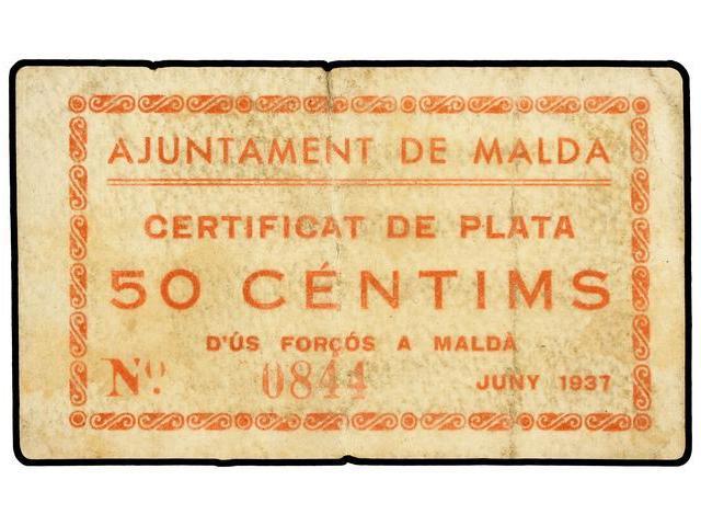 50 Cèntims. Juny 1937. Aj. de MALDA. Cartón. (Algo sucio). RARO. AT-1401; T-1599. MBC-.