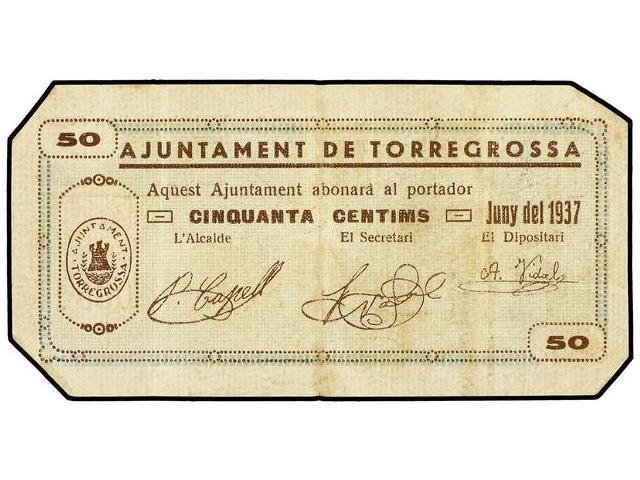 50 Cèntims. Juny 1937. Aj. de TORREGROSSA. (Esquinas cortadas). RARO. AT-2544; T-2961. (MBC+).