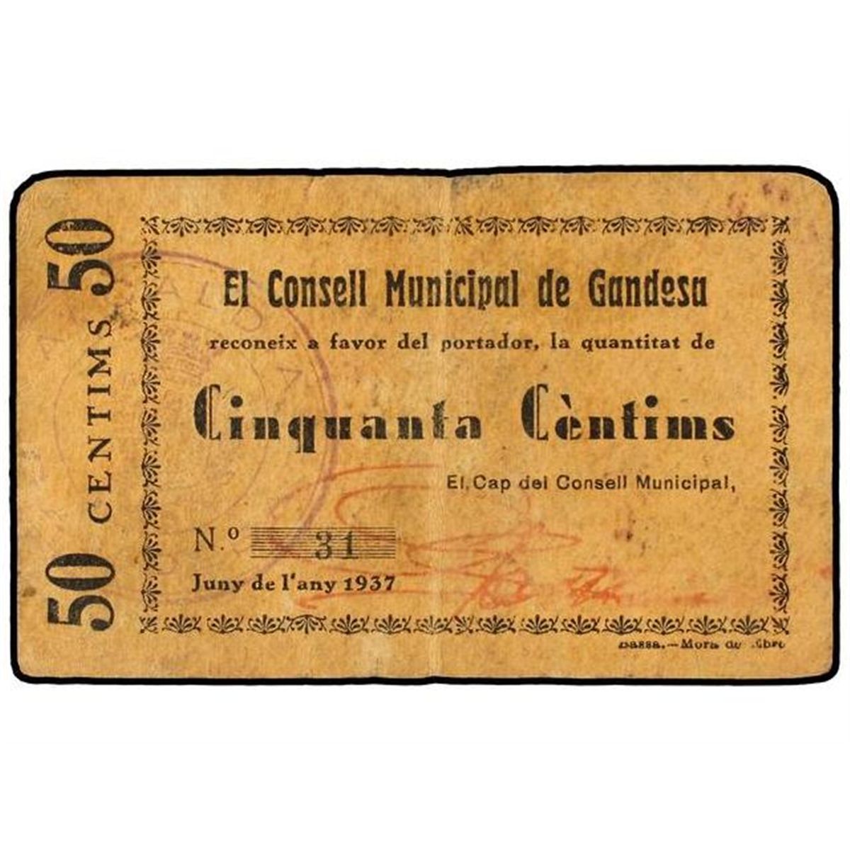 50 Cèntims. - Juny 1937. - C.M. de GANDESA. - AT-1082; T-1253. MBC-. - -