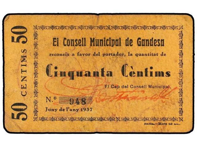 50 Cèntims. Juny 1937. C.M. de GANDESA. Cartón. AT-1082; T-1253. MBC+.