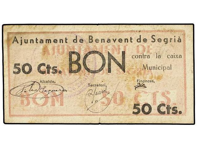 50 Cèntims. - Maig 1937. - Aj. de BENAVENT DE SEGRIÀ. - MUY ESCASO. AT-406; T-479. MBC. - -