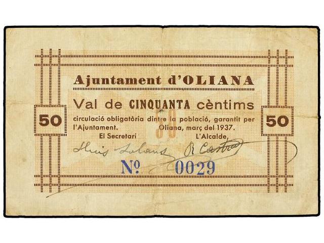 50 Cèntims. Març 1937. Aj. d´OLIANA. (Algo sucio. Leves roturas). RARO. AT-1687; T-1938. MBC.