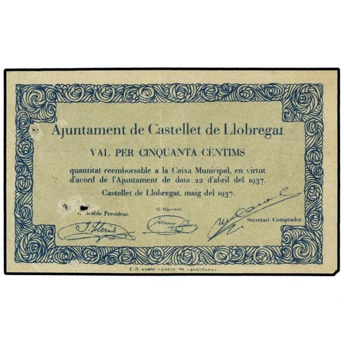 50 Cèntims. - Mayo 1937. - Aj. de CASTELLET de LLOBREGAT. - (Roturas). AT-719; T-843. MBC+. - -