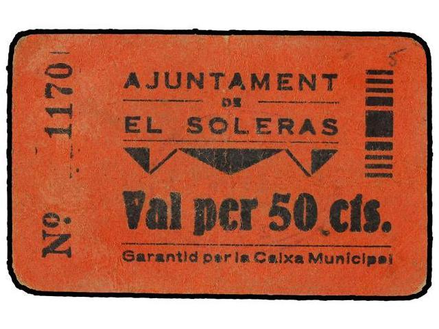 50 Cèntims. S/F. Aj. d´EL SOLERÀS. Cartón. ESCASO. AT-2384; T-2763. MBC.