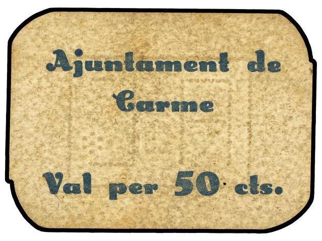 50 Cèntims. S/F. Aj. de CARME. Cartón. (Algo sucio). MUY ESCASO. AT-681 ; T-800. MBC+.