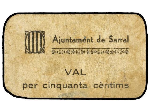 50 Cèntims. S/F. Aj. de SARRAL. Cartón. (Algo sucio). MUY ESCASO. AT-2287; T-2638. MBC+.