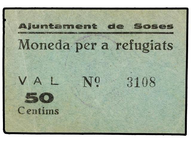 50 Cèntims. S/F. Aj. de SOSES. Moneda per a refugiats. RARÍSIMO. AT-2407. MBC+.