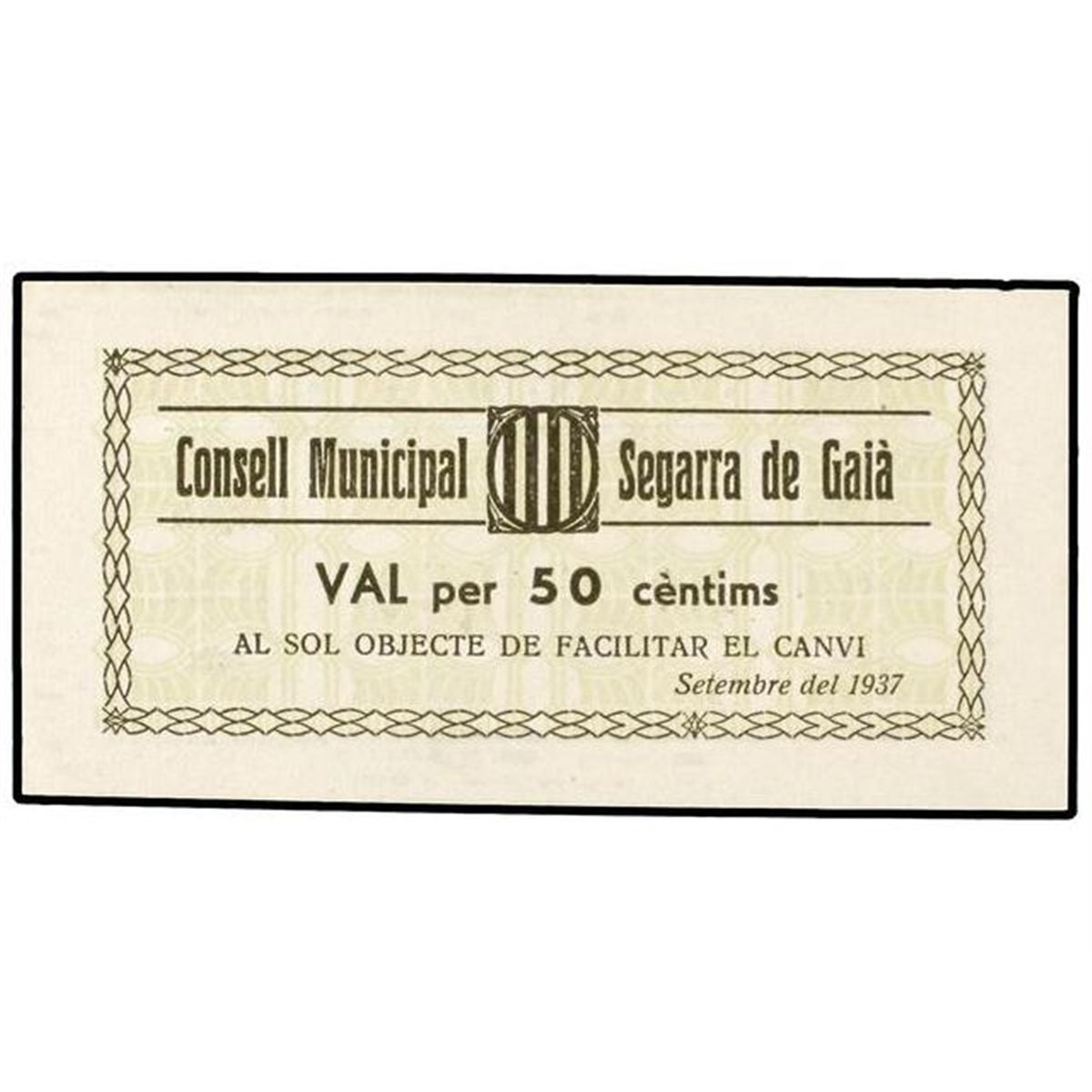 50 Cèntims. - Setembre 1937. - C.M. de SEGARRA DE GAIÀ. - Serie A. AT-2309; T-2675. SC. - -