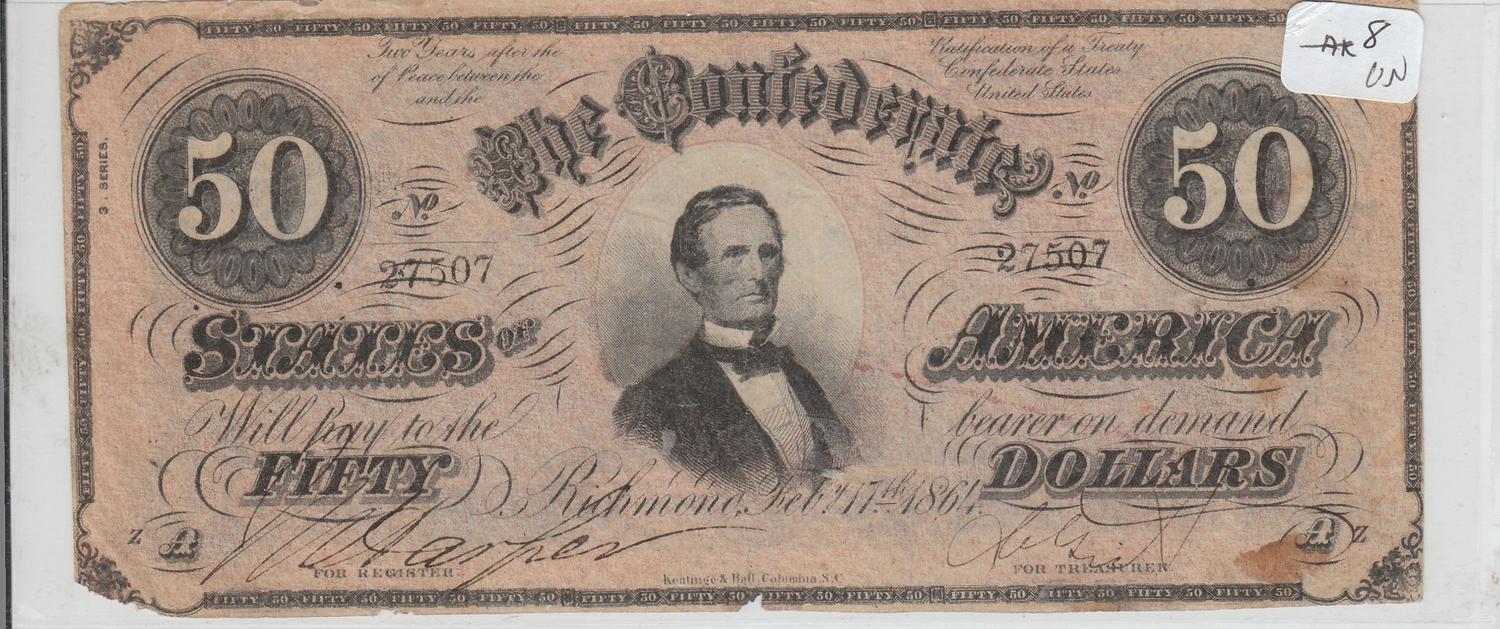 $50 CONFEDERATE CSA 1864 HIGH DENOMINATION