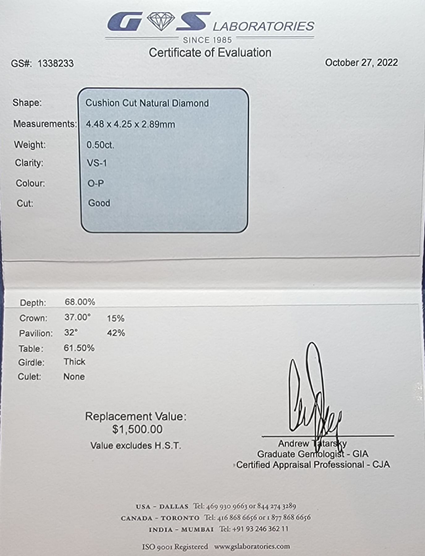 $1500 APPRAISAL CUSHION CUT - INCLUDES APPRAISAL CERTIFICATE APPRAISAL CERTIFICATE FROM EGL. FROM A GEMOLOGIST COLLECTION **ALL ITEMS MUST BE REMOVED BY 5PM MONDAY, NOVEMBER 14TH, 2022. ALL REMAINING ITEMS WILL BE SUBJECT TO A $6.00 PER DAY STORAGE CHARGE. ANY ITEMS REMAINING AFTER SUNDAY, DECEMBER 4, 2022 WILL BE CONSIDERED FORFEITED. NO REFUNDS WILL BE ISSUED FOR FORFEITED ITEMS. TO SCHEDULE A PICK UP APPOINTMENT CLICK HERE