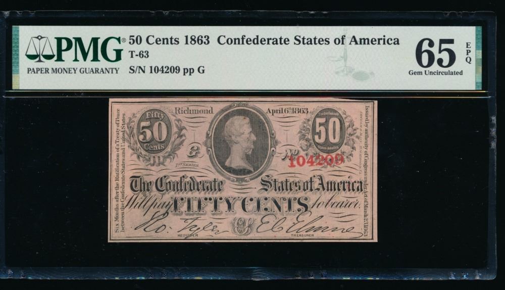 One 50 Cent 1863 Confederate T-63 Note PMG 65EPQ.