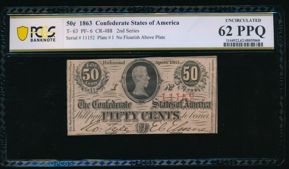 One 50 Cent 1863 T-63 Confederate PCGS 62PPQ.