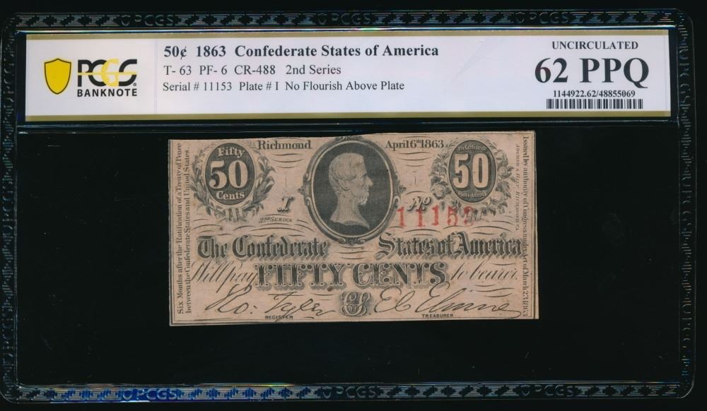 One 50 Cent 1863 T-63 Confederate PCGS 62PPQ.