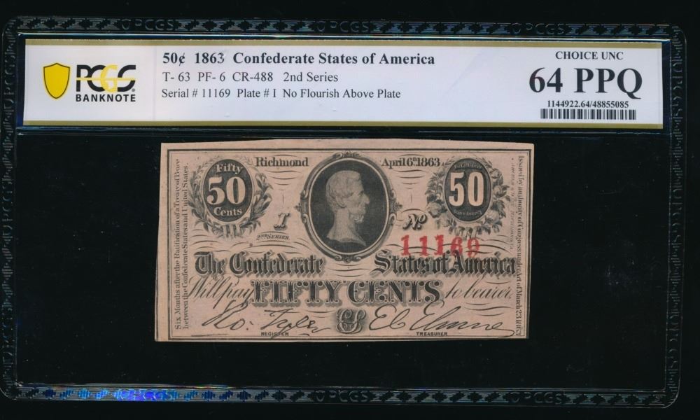 One 50 Cent 1863 T-63 Confederate PCGS 64PPQ.