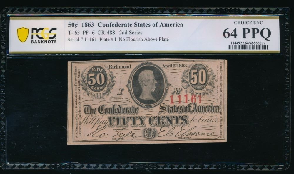 One 50 Cent 1863 T-63 Confederate PCGS 64PPQ.