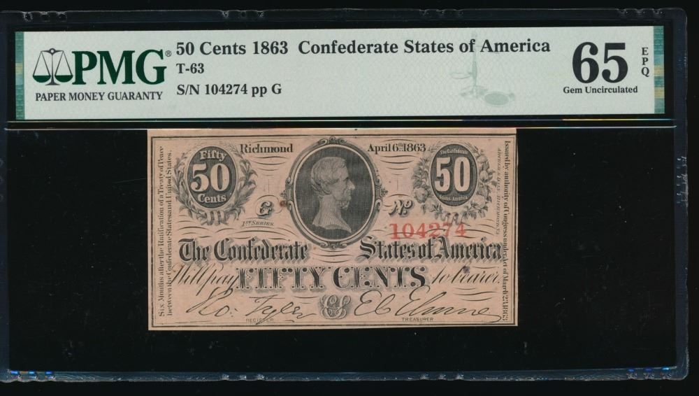 One 50 Cent 1863 T-63 Confederate PMG 65EPQ.