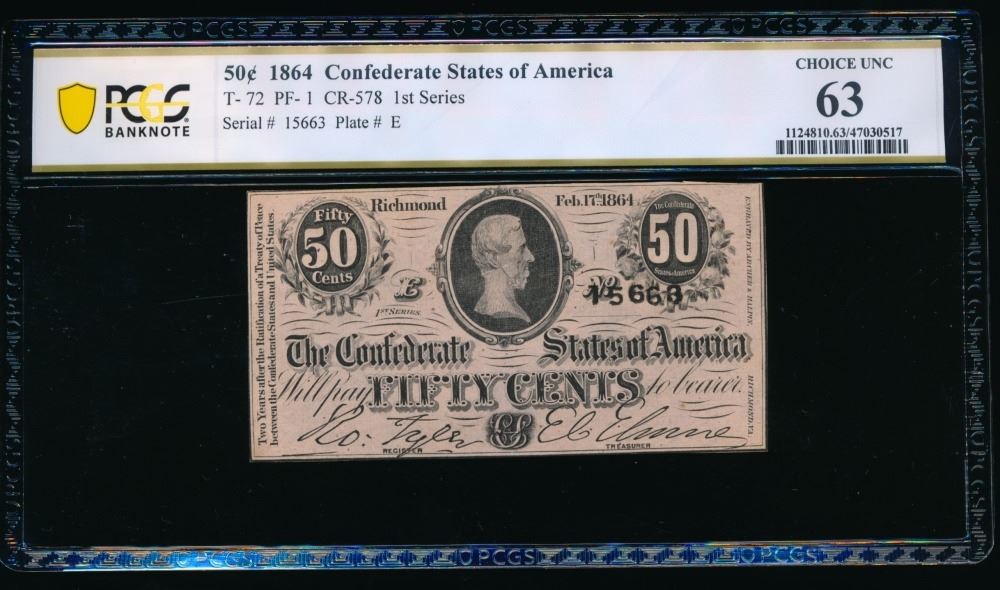 One 50 Cent 1864 T-72 Confederate PCGS 63.