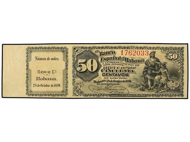 50 Centavos. 28 Octubre 1889. BANCO ESPAÑOL DE LA HABANA. Ed-CU59 var.; LB-60CU, mismo ejemplar; Pick-33. SC.