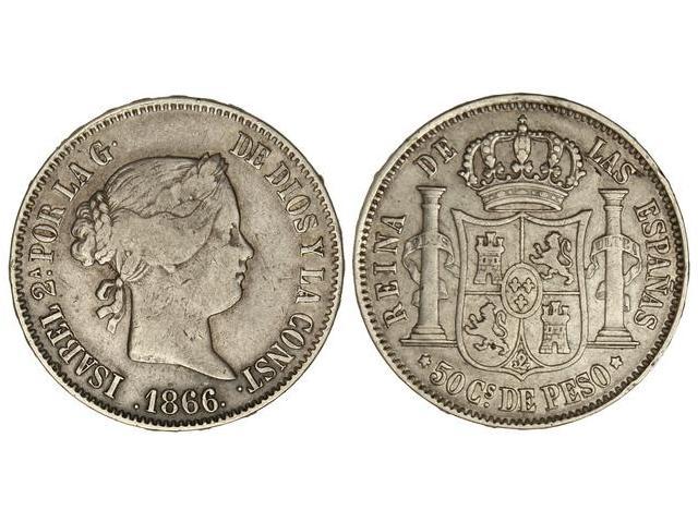50 Centavos de Peso. 1866. MANILA. (Pequeños golpecitos y levísimas rayitas en reverso). Cal-453. MBC-.