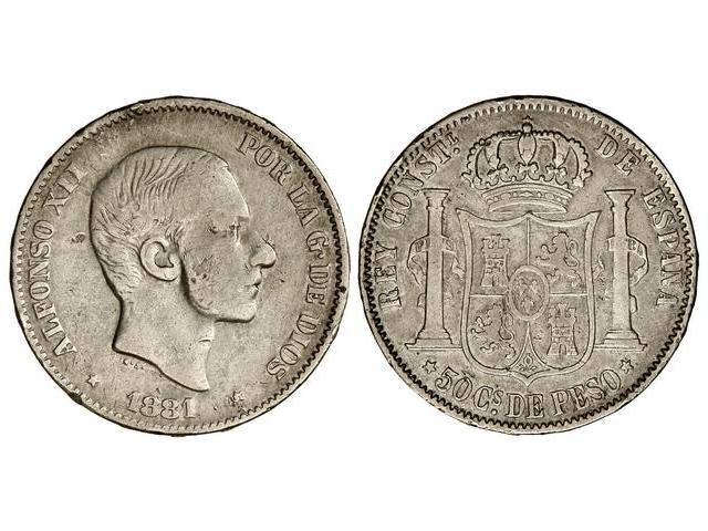 50 Centavos de Peso. 1881. MANILA. (Golpecitos). BC+.